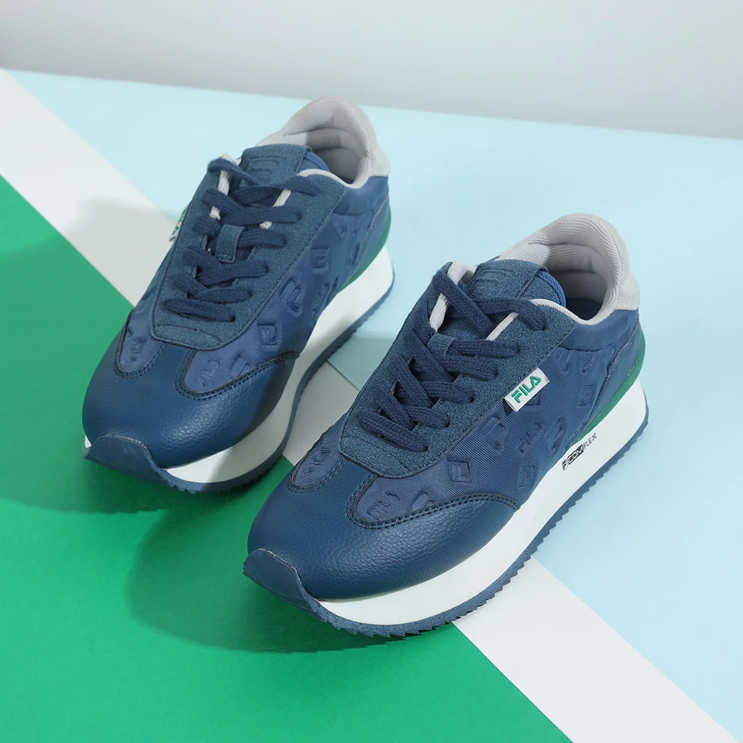 Classic 90's inspired retro sneakers with die-cut sole design, adding a unique, stylish detail to the classic athletic fit. Made from soft, breathable fabric. The upper is made from padded debossed allover pattern blending elements of nostalgia with modern materials and technology, resonating with contemporary fashion trends.